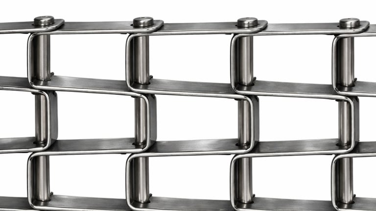 También ofrecemos bandas metálicas propulsadas por cadena, ideales cuando se necesita mayor fortaleza, control de guías, sincronización crítica, paso por líquidos o cuando la banda debe cruzar espacios sin soporte. Estas incluyen configuraciones sobre rodillos, mallas convencionales, clavijas para cargas pesadas y versiones con varillas de apoyo para soporte adicional y facilidad de reparación.